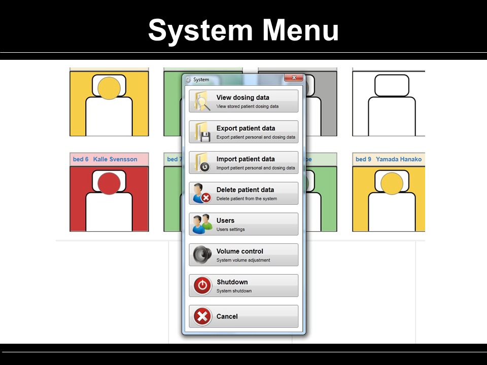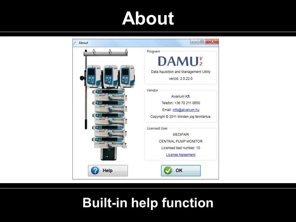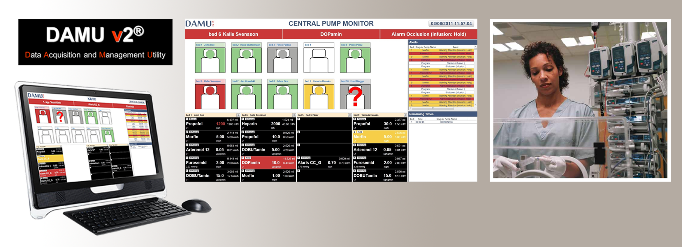This is a pump central data viewing software what is installed onto a min. 19” touchscreen AIO PC that can work without keyboard and mouse and is capable to acquire and display data from the operating Alaris pumps placed on Alaris Gateway Workstations (AGW) at patient beds. The system language as well as alarms/warnings can be localized.