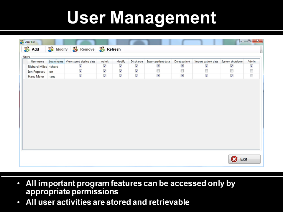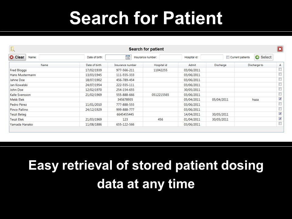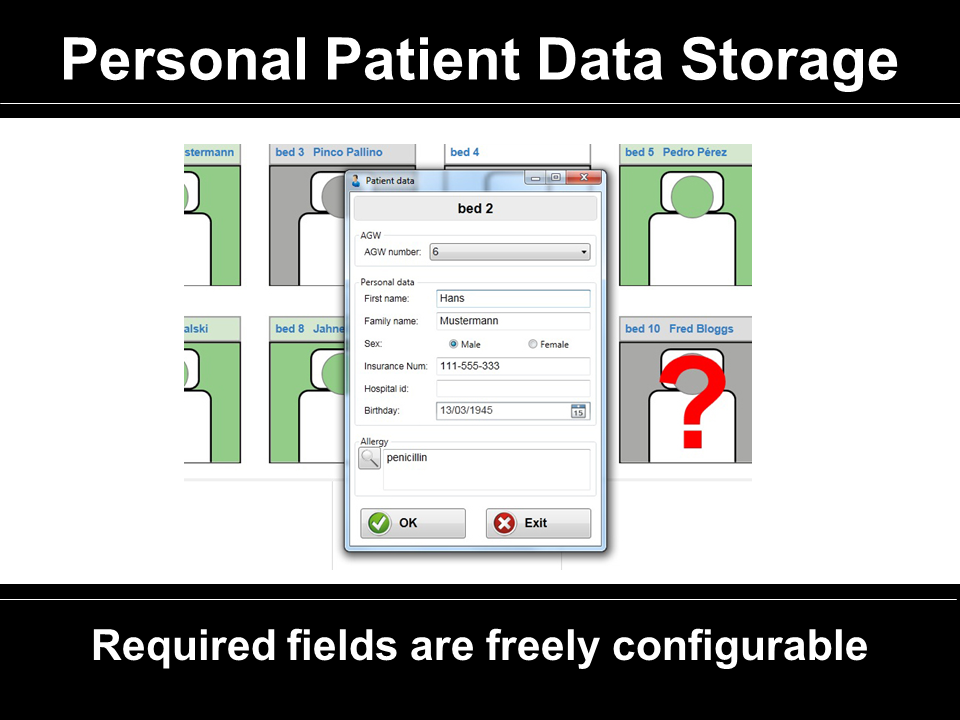 The program is capable to store basic patient data e.g. name, date of birth, patient IDs, allergy information. The information can be accessed anytime by the authorized users. This software provides great help in relieving the small staffs of overloaded nurses as well as in optimization of work sessions, and improves safety of patients.