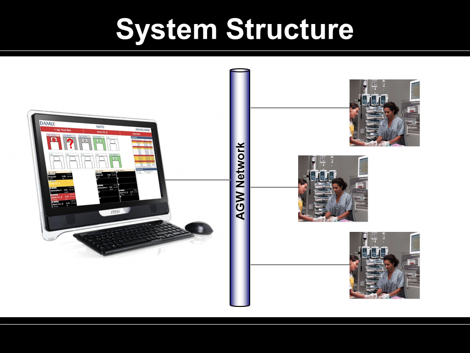 The system operation requires an installed UTP Ethernet network between the patient bed and nurse station. Both the central pump monitor and the AGWs must be provided with free network connections each. For the stable and continuous operation of DAMU, the user is recommended to ensure an uninterrupted power supply as well.