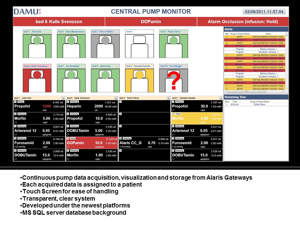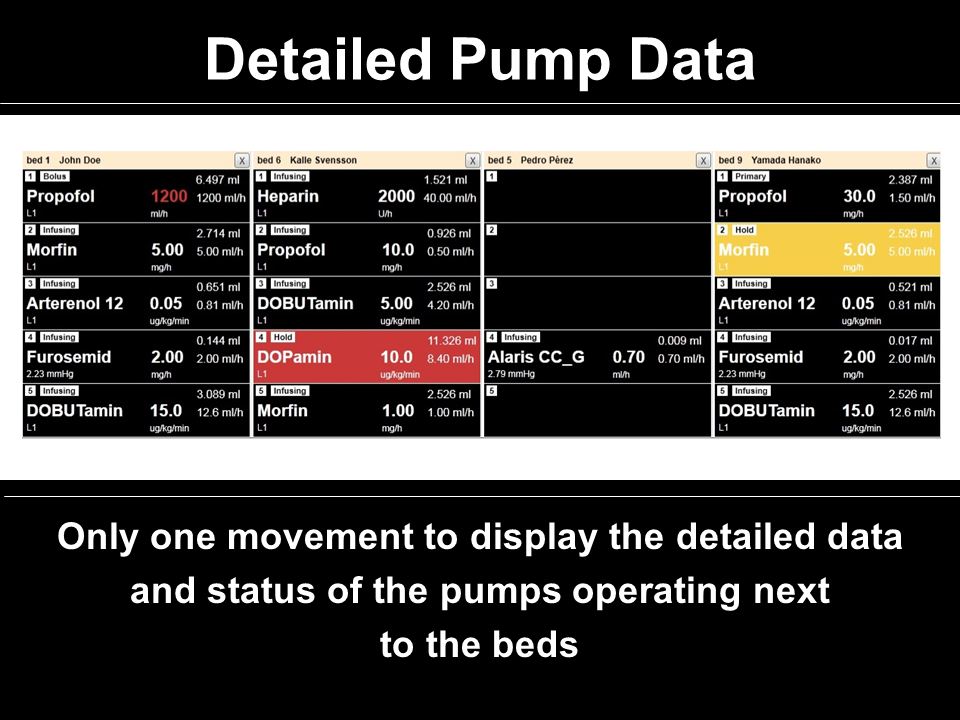 In case a bedside pump generates alarm, that will also be displayed with delay on the central monitor providing user information about the place and reason of the alarm.