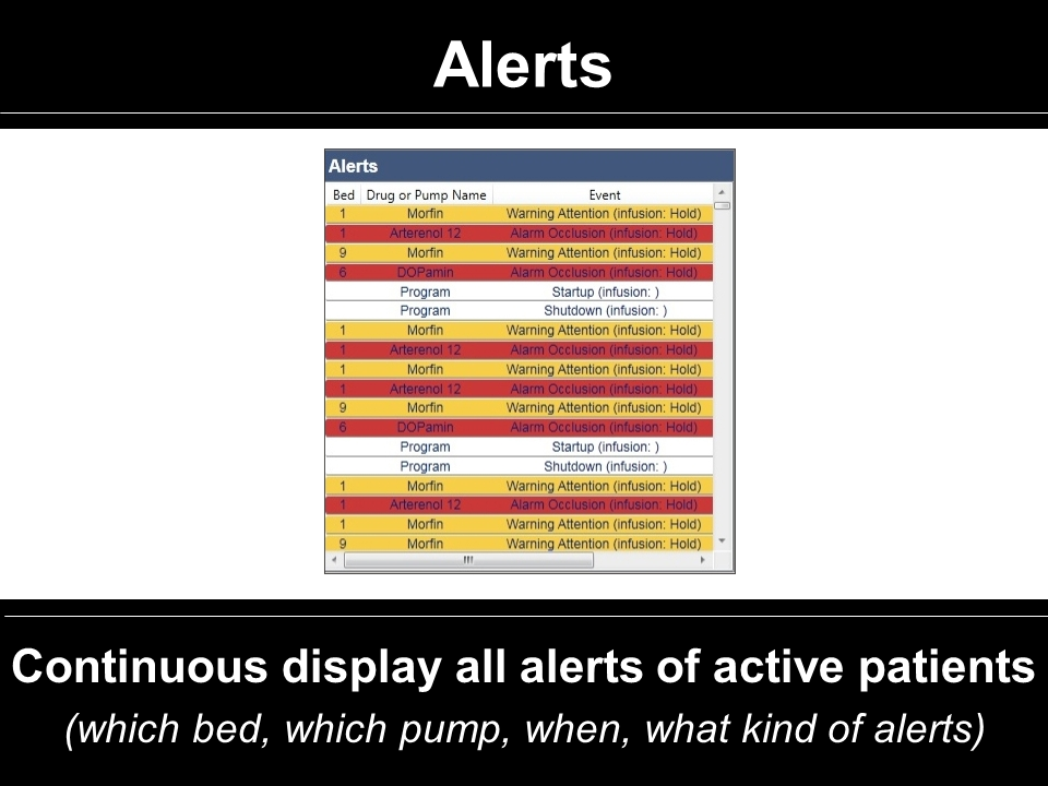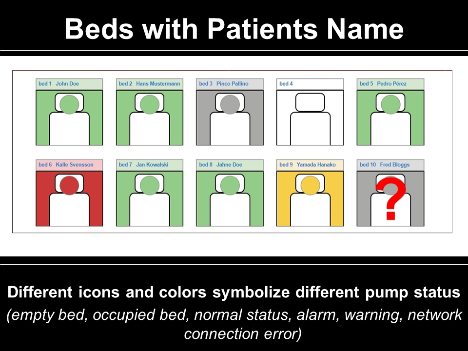 Installed on the nurse station, the device provides continuous information on the status of bedside pumps for the staff with some delay. The entire software language is English or the local language. The alarms/warnings received from the pumps are also displayed in this language.
